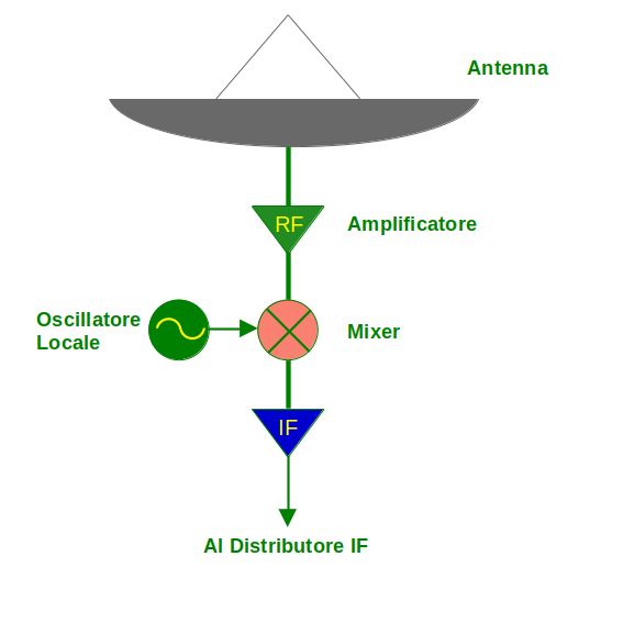 Quando si vuole ricevere un segnale radio si deve selezionare la frequenza alla quale vogliamo riceverlo. Supponiamo di voler esaminare l’emissione radio di una radiogalassia alla frequenza di 1.6 GHz. Si dice che la frequenza di cielo o Radio Frequency (RF) a cui vogliamo osservare è, appunto, 1.6 GHz. È importante stabilire a quale frequenza vogliamo osservare per molti motivi, che potrete trovare nella sezione Osservare nella banda radio. Per selezionare solo l’emissione a questa frequenza dobbiamo avere un filtro che faccia passare solo una banda, ossia un intervallo di frequenze, intorno alla frequenza di 1.6 GHz e dobbiamo avere uno strumento che legga la potenza entro la banda. Ma se poi vogliamo osservare lo stesso oggetto ad un’altra frequenza di cielo, diciamo a 22 GHz, oltre all’horn come abbiamo già visto, dovremo cambiare sia il filtro che lo strumento di lettura, perché per filtrare e leggere la potenza a due frequenze diverse servono strumenti costruiti diversamente. Il sistema supereterodina ci consente di utilizzare un solo strumento come filtro e lettura perché il segnale raccolto dall’antenna, quale che sia la sua frequenza, viene convertito in un segnale ad una frequenza chiamata Frequenza Intermedia (IF). Come si può vedere in fig. 9, il segnale raccolto dall’antenna viene fatto passare attraverso un mixer e combinato con un segnale prodotto da uno strumento chiamato oscillatore locale (LO).