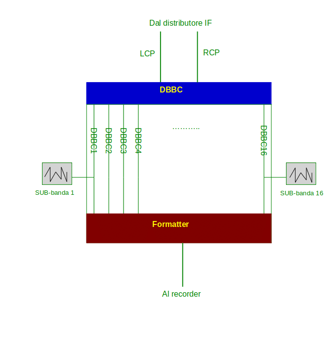 In sostanza, ciascuna frequenza si sposta nelle guide d’onda e poi nella fibra ottica per suo conto, insieme all’intensità che è proporzionale all’intensità della radiazione che è arrivata sul radiotelescopio dalla sorgente. Il back-end si occupa di suddividere queste informazioni in sotto-bande, intervalli di frequenza la cui larghezza viene stabilita secondo il tipo di osservazione e quello che si vuole ottenere. Lo schema lo si può vedere in fig. 14. Il flusso di dati arriva tramite la fibra ottica attraverso il distributore IF al DBBC; qui la banda viene filtrata in un certo numero di sottobande di frequenza e larghezza decise dagli astronomi che hanno richiesto l’osservazione; infine il formatter presente nel DBBC provvede a creare il flusso ordinato di dati che verranno registrati in sequenza sul supporto magnetico, in modo da poter essere recuperati nello stesso ordine quando verranno utilizzati.