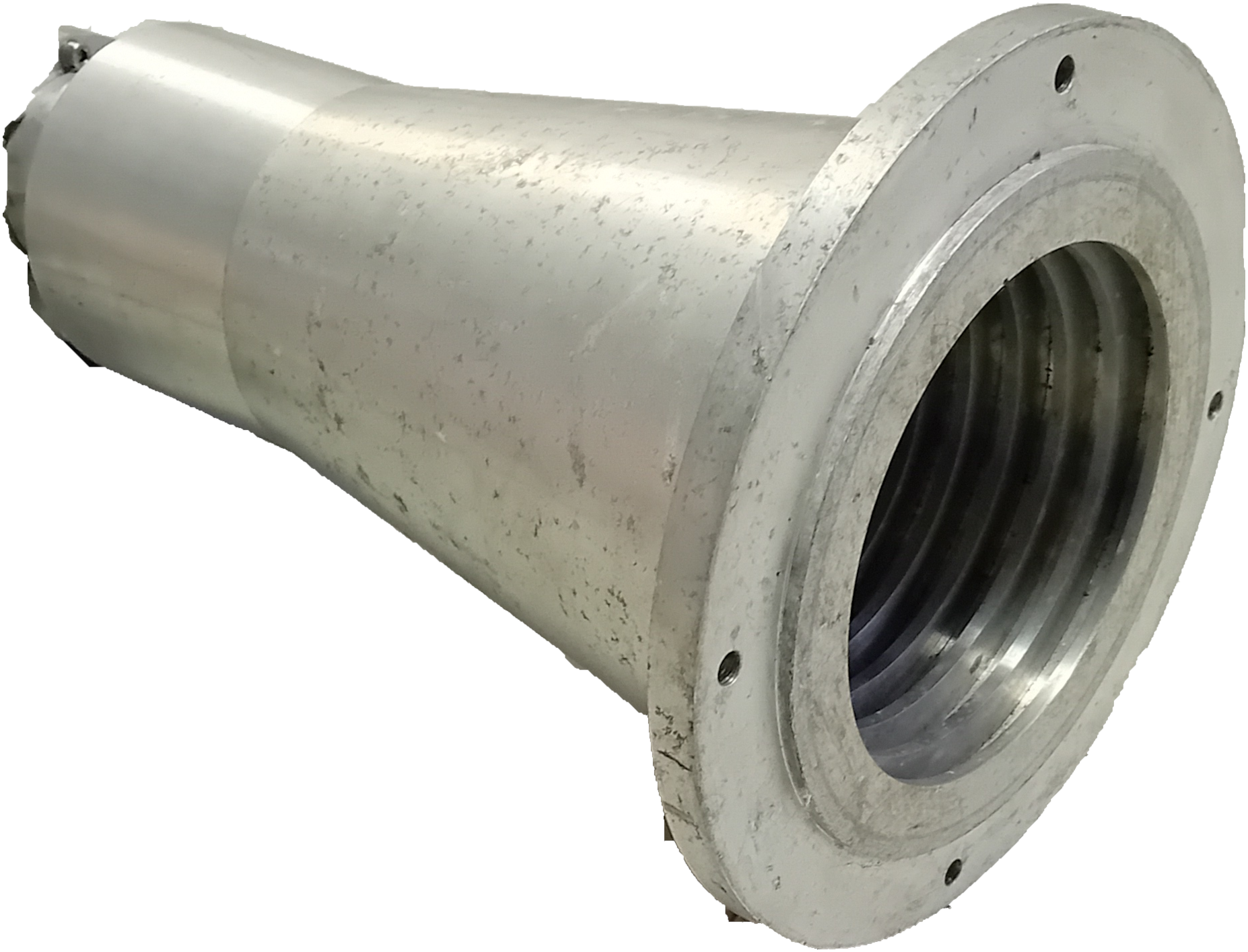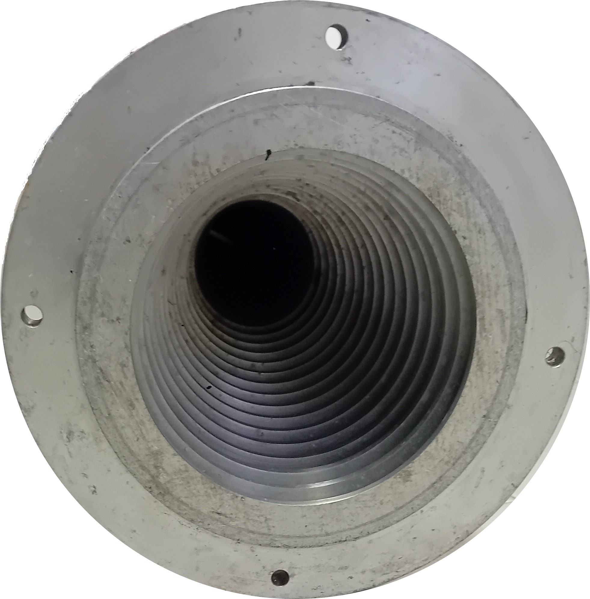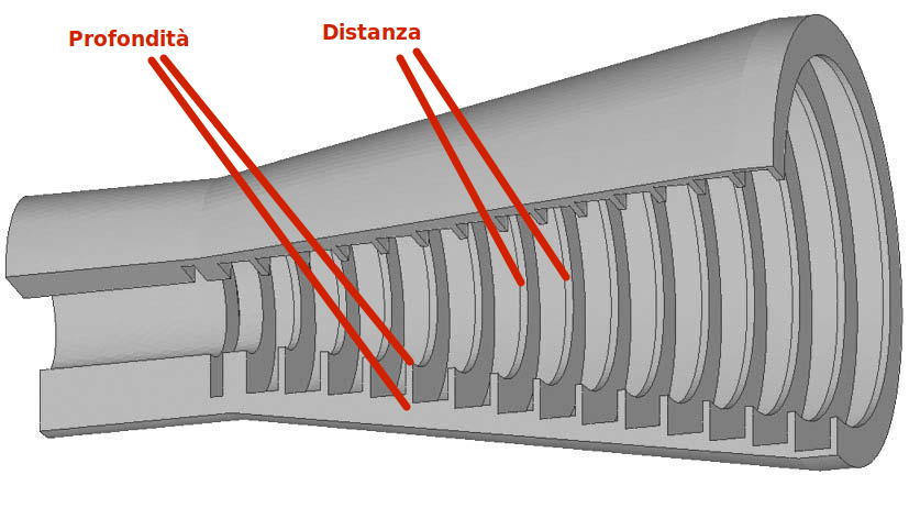 Un horn è fatto generalmente in alluminio, un materiale conduttore, perché deve entrare “in relazione” con l’onda elettromagnetica. Una struttura che consente all’onda elettromagnetica di propagarsi al suo interno con il minimo di perdite è chiamata guida d’onda. In fig. 2 vedete una sezione di un horn. La forma conica e la corrugazione, ossia le “lamelle” che vedete nella figura, servono ad offrire la minor resistenza possibile alla propagazione dell’onda lungo l’horn, perché la radiazione possa essere condotta con la minor perdita possibile fino alla parte veramente sensibile del front-end. Esse hanno strettamente a che fare con la lunghezza d’onda (λ) della radiazione ricevuta: la profondità della corrugazione deve essere intorno a ¼ della lunghezza d’onda della radiazione che si intende raccogliere e la distanza tra le lamelle deve essere circa ⅓ λ.